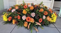 Cette composition de forme allongée réalisée à la main par votre artisan fleuriste, à partir de fleurs fraîches. Les tons chauds d’orange et de jaune, associés à un feuillage structuré, apportent une présence florale élégante et apaisante lors des cérémonies.